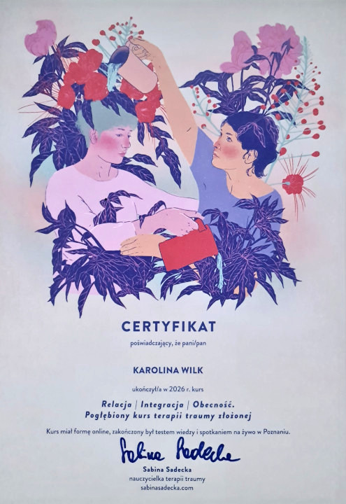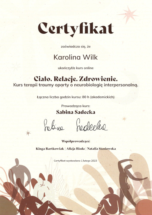 Ciało. Relacje. Zdrowienie. Kurs terapii traumy oparty o neurobiologię interpersonalną. – Sabina Sadecka (zobacz certyfikat)