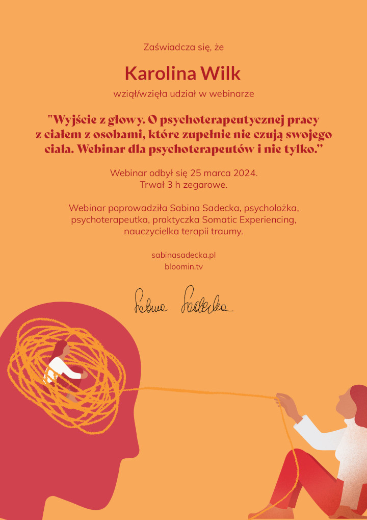 Wyjście z głowy. O psychoterapeutycznej pracy z ciałem z osobami, które zupełnie nie czują swojego ciała. – Sabina Sadecka (zobacz zaświadczenie)