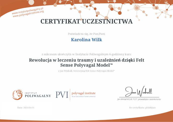 Rewolucja w leczeniu traumy i uzależnień dzięki Felt Sense Polyvagal Model™ – Instytut Poliwagalny – Jan Winhall (zobacz certyfikat)