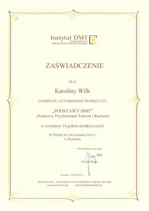 Podstawy Psychoterapii Tańcem i Ruchem – Instytut DMT – Justyna Bajew (zobacz zaświadczenie)