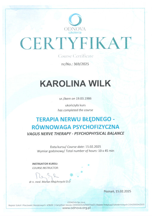 Terapia Nerwu Błędnego – równowaga psychofizyczna – Odnova – dr. Marian Majchrzycki (zobacz certyfikat)