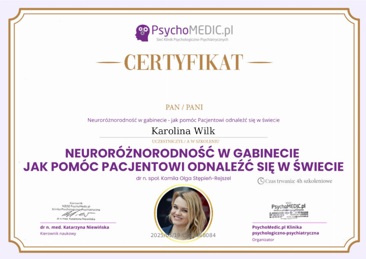 Neuroróżnorodność w gabinecie – jak pomóc pacjentowi odnaleźć się w świecie – dr n. społ. Kamila Olga stępień – Rejszel (zobacz certyfikat)