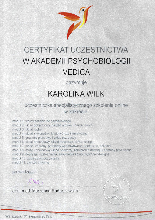 Akademia Psychobiologii – dr Marzanna Radziszewska (zobacz certyfikat)